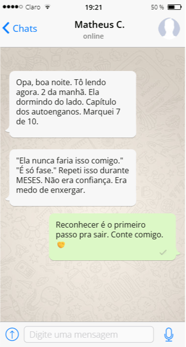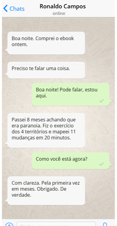 Leia o guia inteiro. Faça os exercícios. Se em 7 dias sentir que não valeu — devolvo 100% do seu dinheiro. Sem perguntas. Sem constrangimento. Sem burocracia. Você tem 7 dias pra testar com calma e decidir se fez sentido pra você.